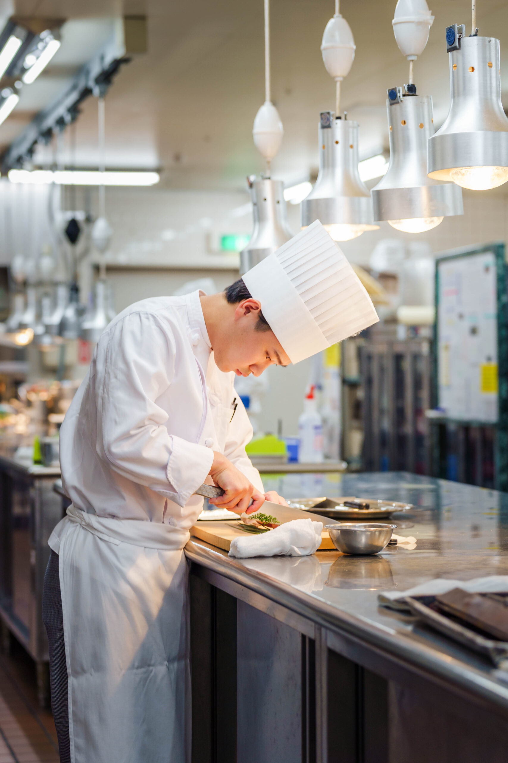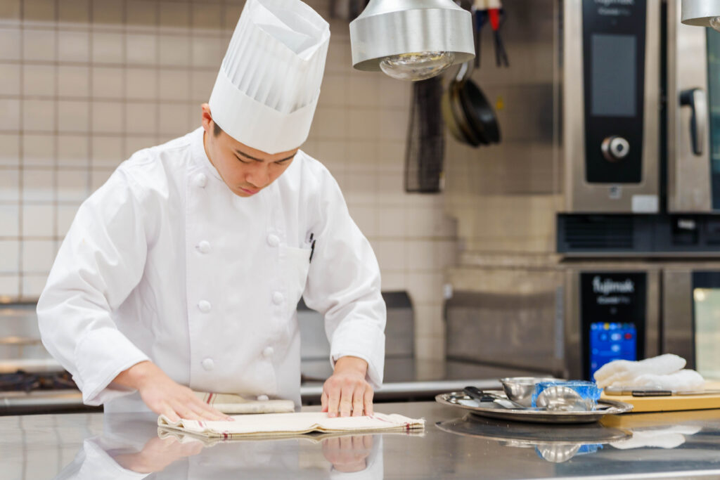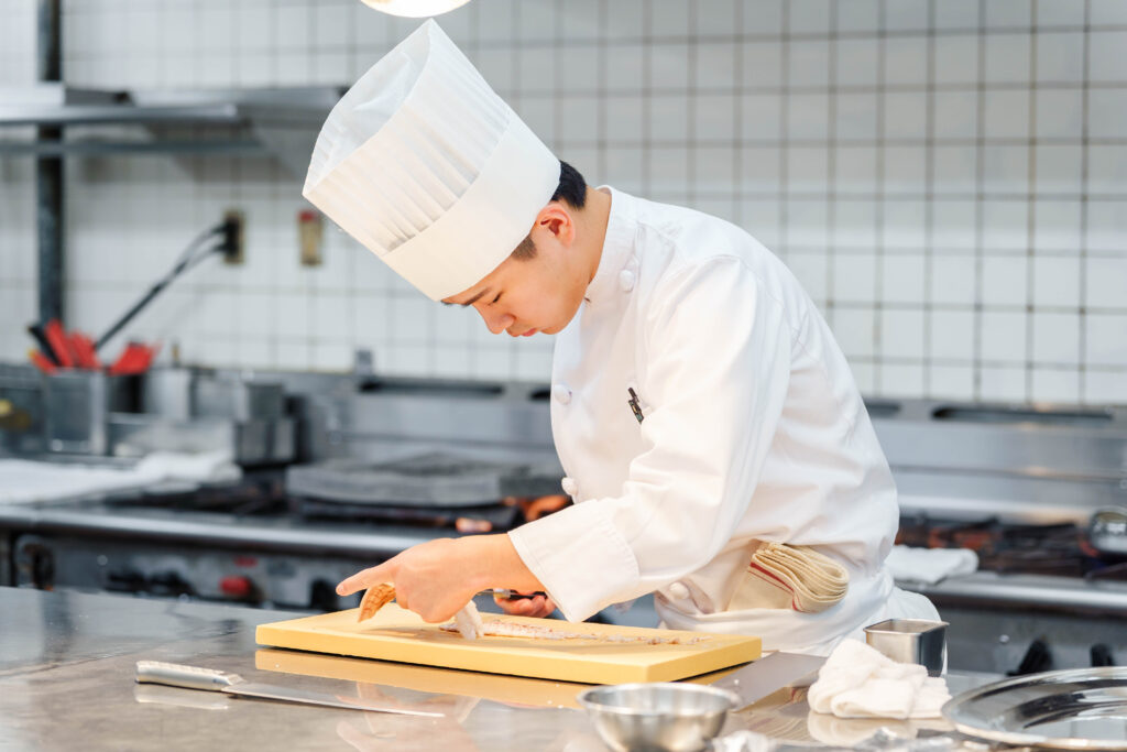 コンクールを経験して一番変わったのは、「常に見られている」という意識です。本番ではタオルの折り方ひとつまで見られていたので、普段からお客様から見えない部分でも丁寧さを心がけるようになりました。日常業務に戻ってからも自然と身だしなみや所作に気を配れるようになり、今ではお客様の前でも堂々と調理できる自信がつきました。